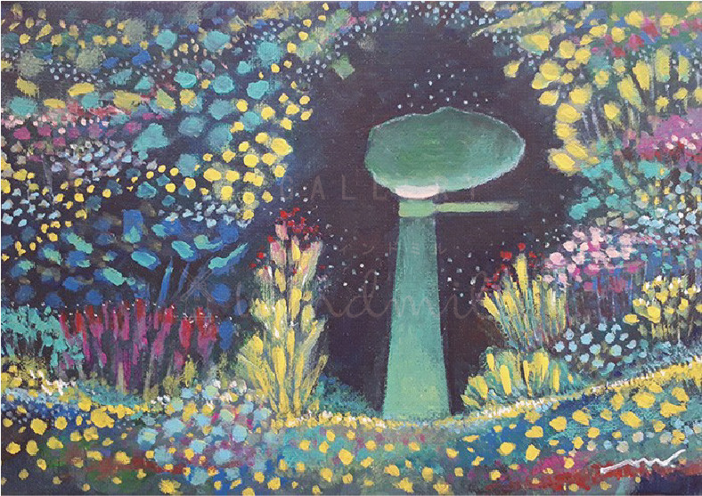 暗闇の中、花々が導いてくれている。花の道を通っていく先はまだ見ぬ約束の場所。静かに進むその先で旅人は大事なものと出会えるだろう。旅の途中、夢の中で、花に導かれる旅人を描きました。