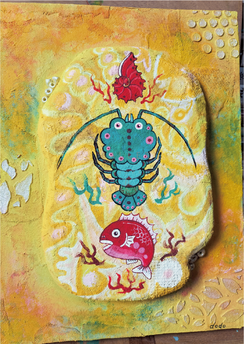 画材:ベニヤ、スタイロフォーム、アクリル、モデリングペースト、メディウム、下地にはガーゼ、木粉粘土