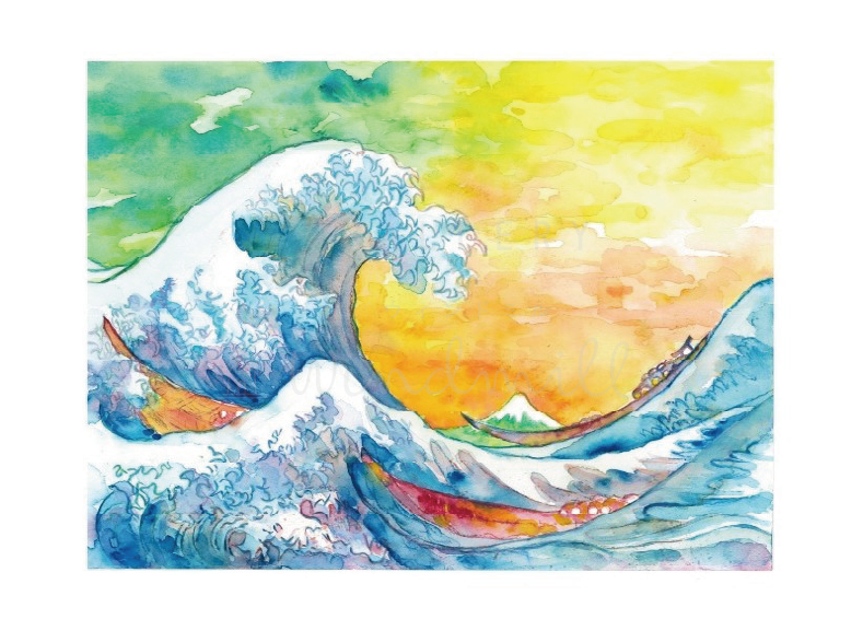 葛飾北斎の名画「富嶽三十六景 神奈川沖浪裏」のオマージュ作品。
