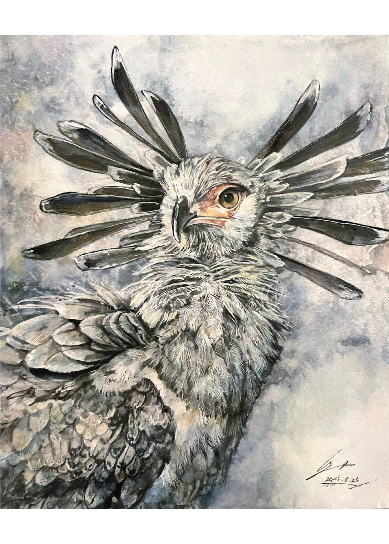 寒空の下、木の上に巣を構えながら周囲を警戒するヘビクイワシを描いた作品。