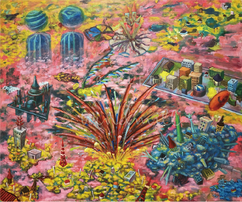 どんな時にも「始まり」が訪れます。それが起きる時に生じるエネルギーの量は予測しきれないものです。小さな出来事でもそれがキッカケに突然火が付き、そこからキャパを超越してしまう程の速度で爆散していく感情のエネルギーを巨大な翼と雲上に描きました。中央から翼が飛び出す場所が爆心地となっています。